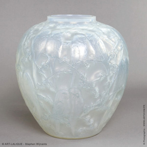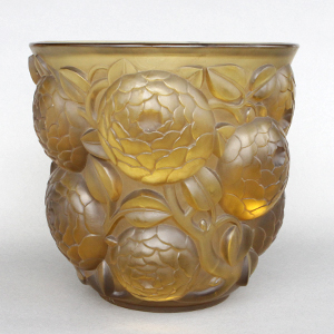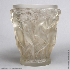 En témoigne son mythique vase «Bacchantes» (p.28 du cat. Christie's Londres 2012) où une ronde de femmes nues, toutes dans des positions différentes, forme à la fois le décor et le corps du vase. Ici, l'opalescence obtenue par ajout d'arsenic au verre lui apporte une touche de rêve nacré que l'on retrouve également dans la boîte Rose créée en 1921, (cf Bonhams, vente au Grand Palais, Paris 07/02/2013).