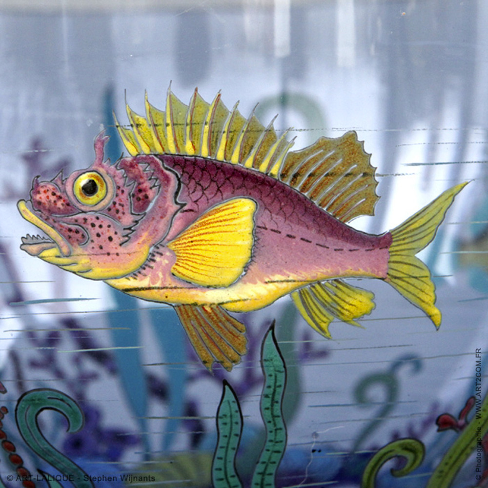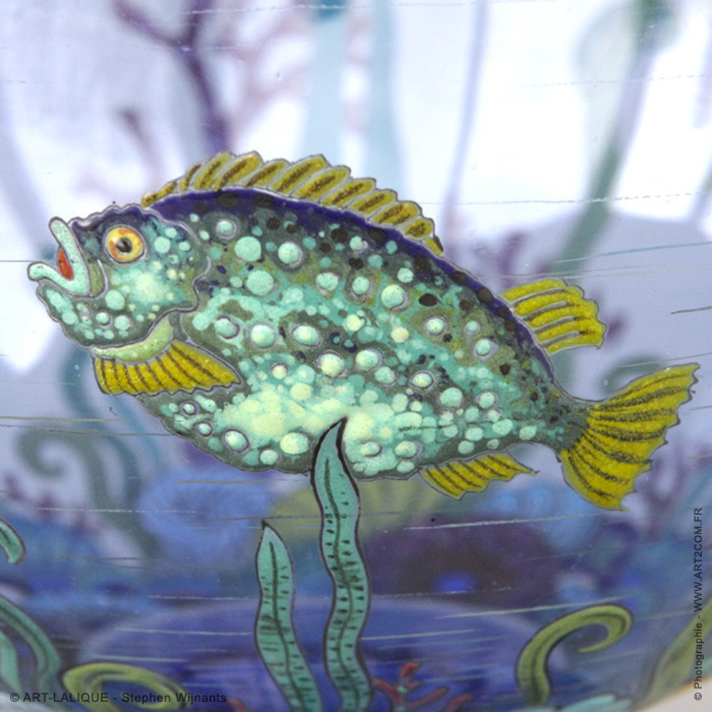 Verre bleu saphir émaillé de poissons et d'algues.