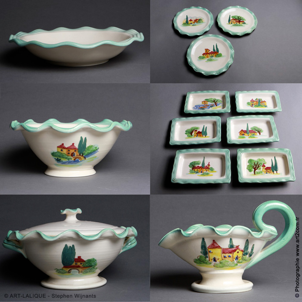 24 grandes assiettes - 12 moyennes assiettes - 11 petites assiettes - 18 assiettes à soupe - 1 soupière - 1 saucière - 1 plat rond - 2 plats ronds creux - 1 plat ovale - 1 saladier - 6 raviers.