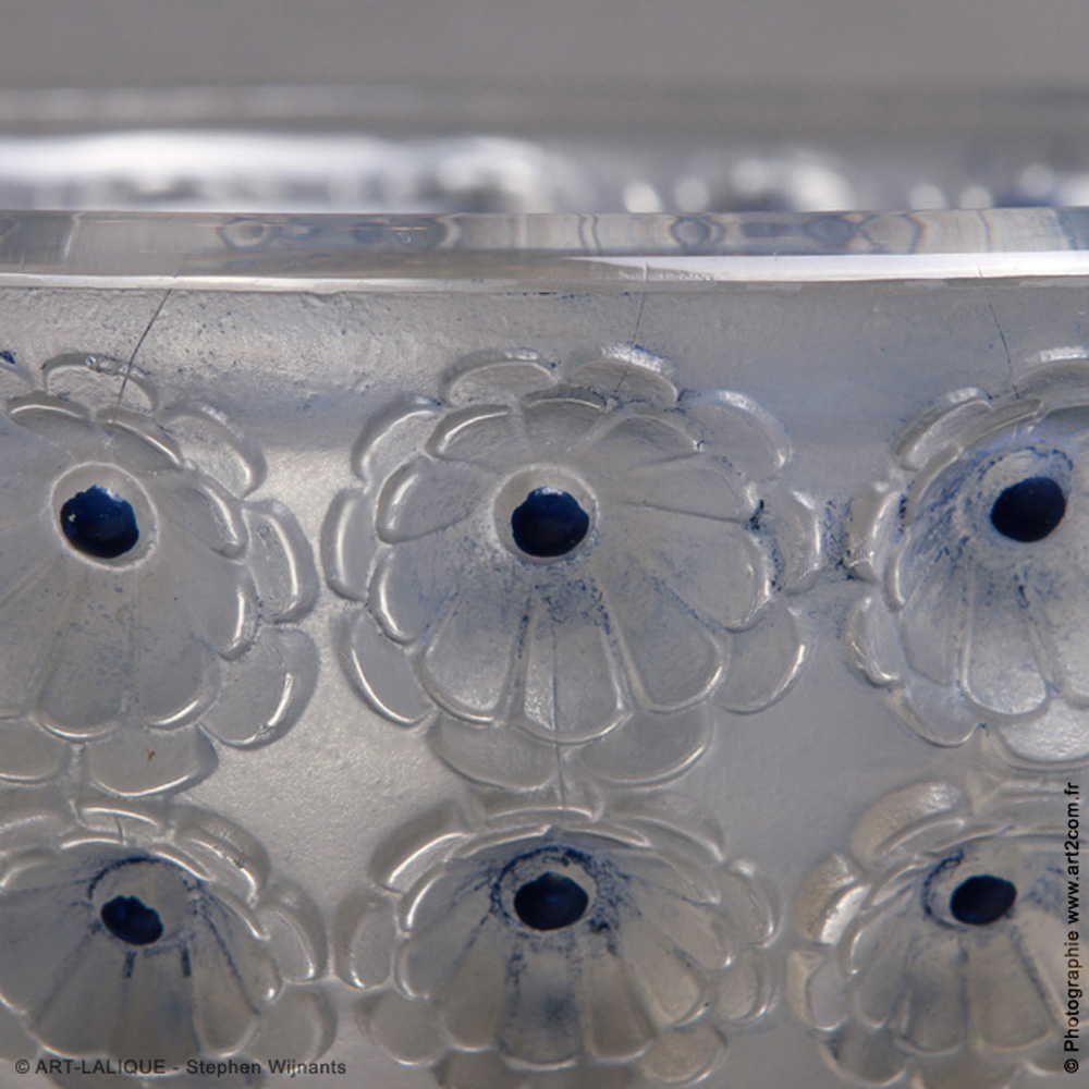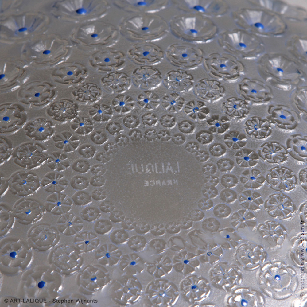 Verre blanc émaillé bleu. Référence : Félix Marcilhac, catalogue raisonné de l'oeuvre de verre de R.Lalique, éd. de l'Amateur Paris, 1994, p. 299