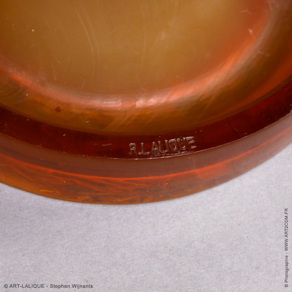Verre couleur orange. Référence : Félix Marcilhac, catalogue raisonné de l'oeuvre de verre de R.Lalique, éd. de l'Amateur Paris, 1994, p. 269