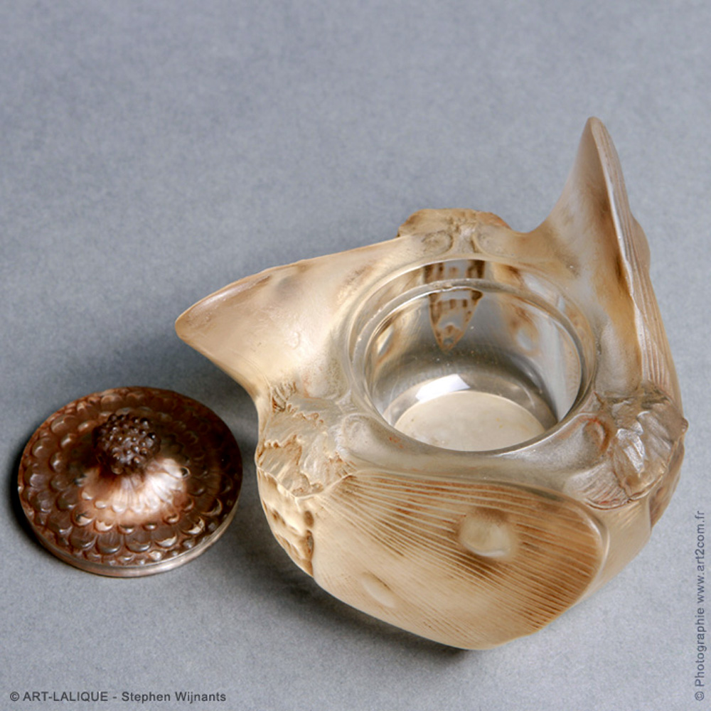 Verre blanc - Patine Sienne. Référence : Félix Marcilhac, catalogue raisonné de l'oeuvre de verre de R.Lalique, éd. de l'Amateur Paris, 1994, p. 315