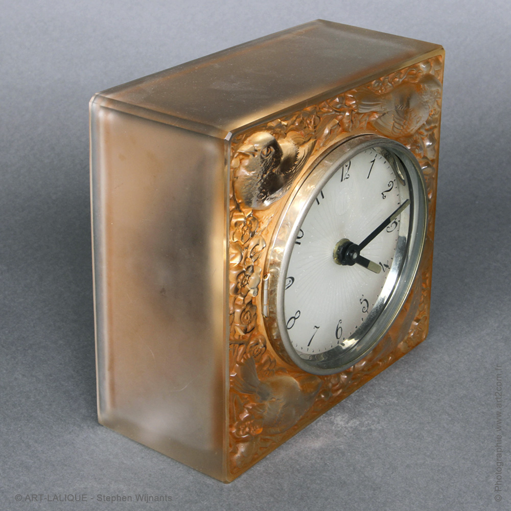 Pendule électrique ATO - Verre blanc - Patine sépia. Référence : Félix Marcilhac, catalogue raisonné de l'oeuvre de verre de R.Lalique, éd. de l'Amateur Paris, 1994, p.370