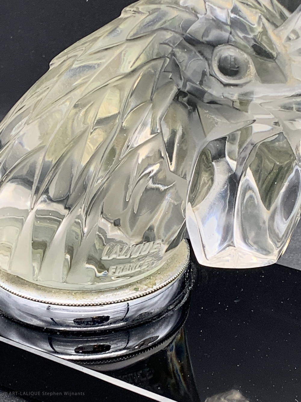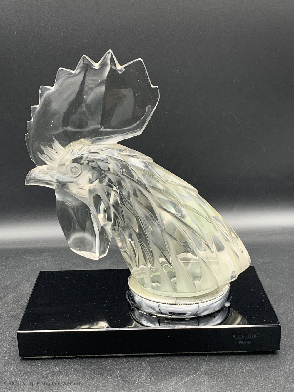 Verre blanc - Socle en verre noir. Référence : Félix Marcilhac, catalogue raisonné de l'oeuvre de verre de R.Lalique, éd. de l'Amateur Paris, 1994, p.511