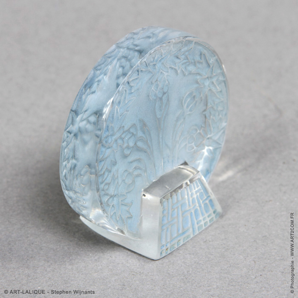 Verre blanc - Patine bleue. Référence : Félix Marcilhac, catalogue raisonné de l'oeuvre de verre de R.Lalique, éd. de l'Amateur Paris, 1994, p. 248