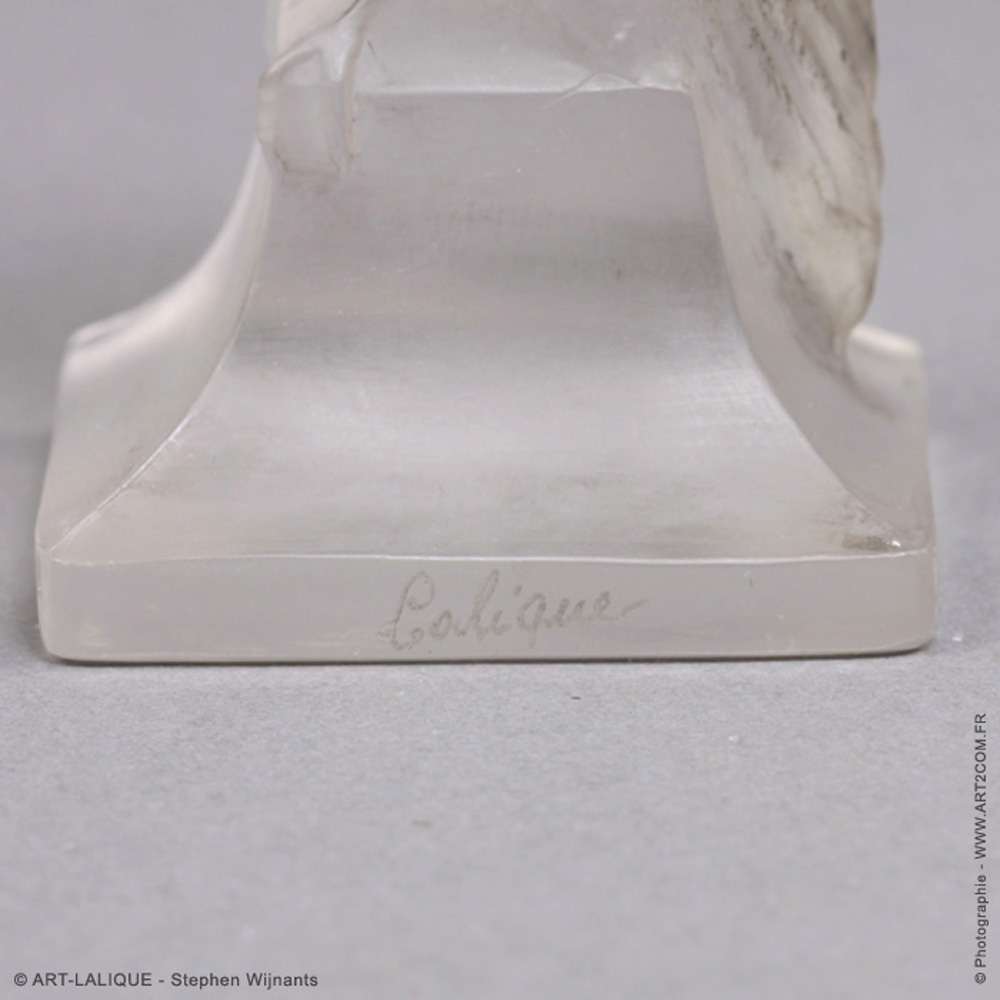 Verre blanc - Patine grise. Référence : Félix Marcilhac, catalogue raisonné de l'oeuvre de verre de R.Lalique, éd. de l'Amateur Paris, 1994, p. 249