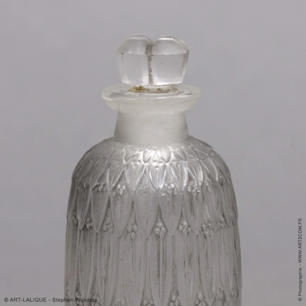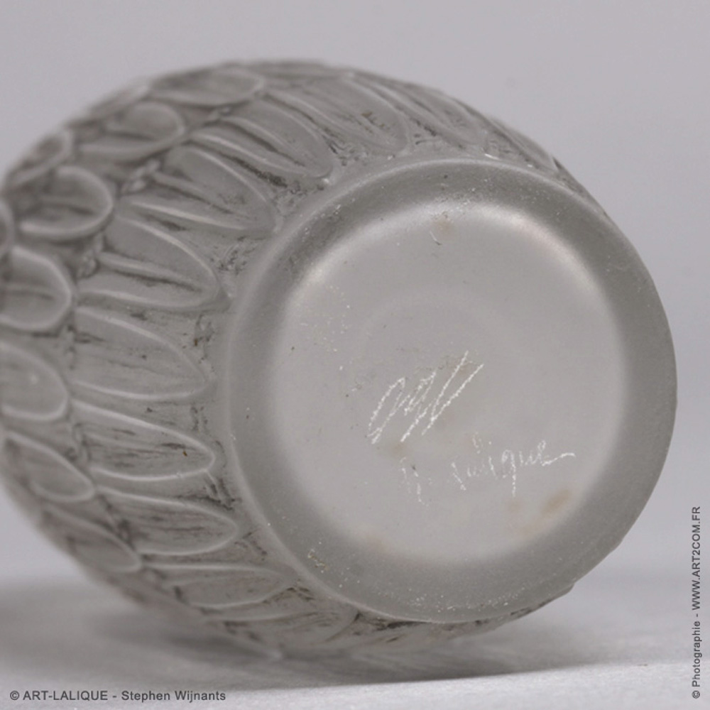 Verre blanc, patiné gris. Référence : Félix Marcilhac, catalogue raisonné de l'oeuvre de verre de R.Lalique, éd. de l'Amateur Paris, 1994, p. 325