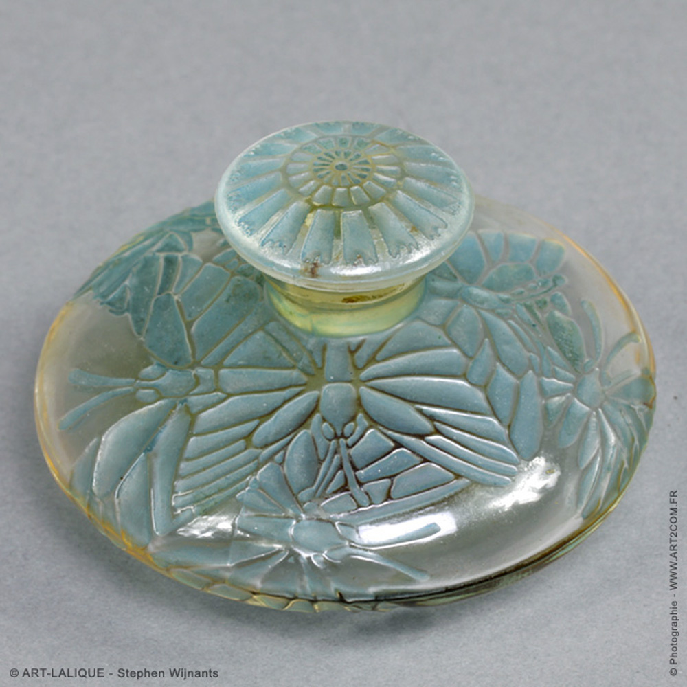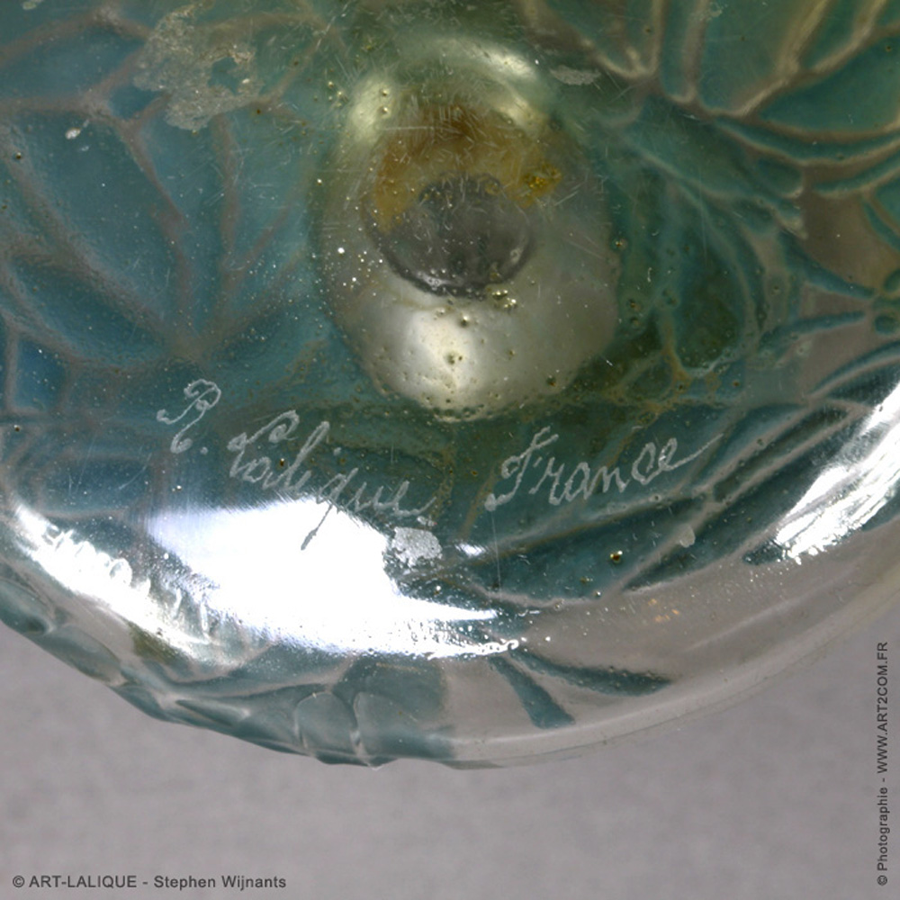 Verre blanc - Patine bleue. Référence : Félix Marcilhac, catalogue raisonné de l'oeuvre de verre de R.Lalique, éd. de l'Amateur Paris, 1994, p. 946