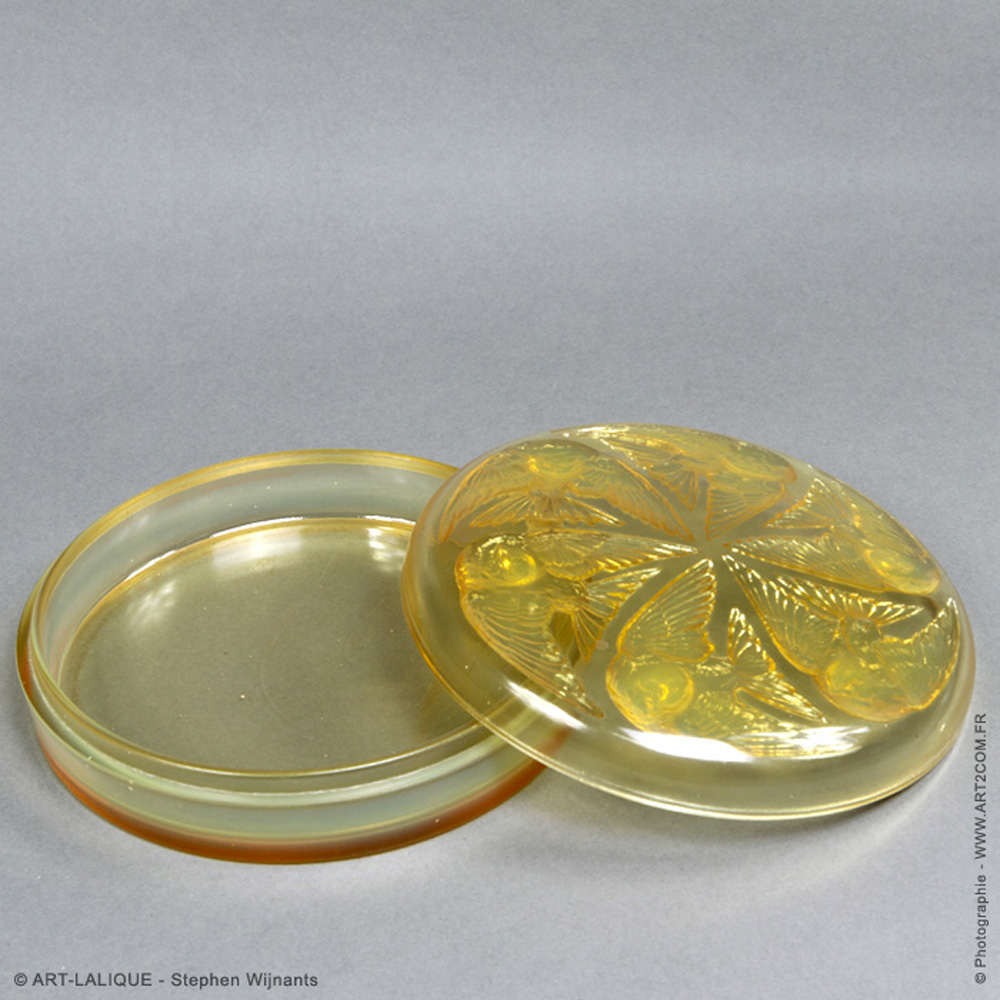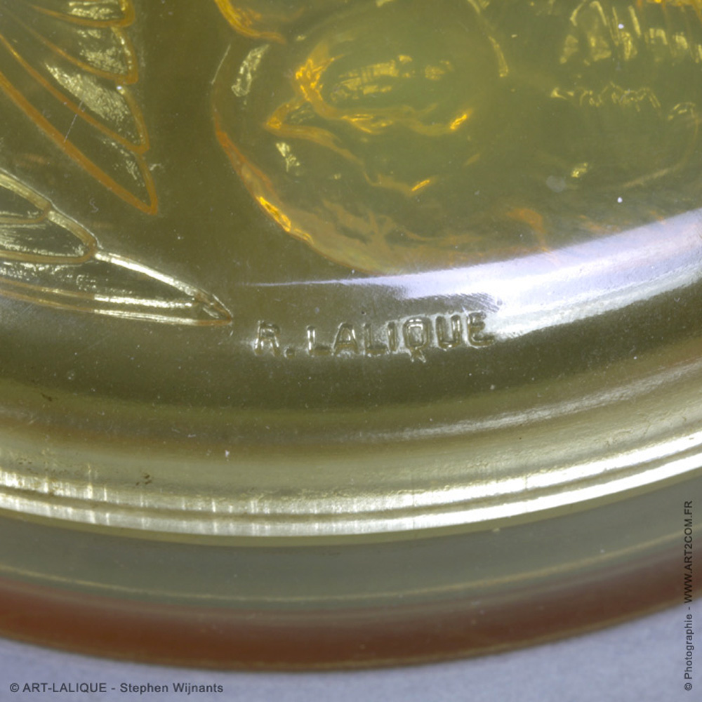Verre à double couche, jaune, opalescent. Référence : Félix Marcilhac, catalogue raisonné de l'oeuvre de verre de R.Lalique, éd. de l'Amateur Paris, 1994, p. 232