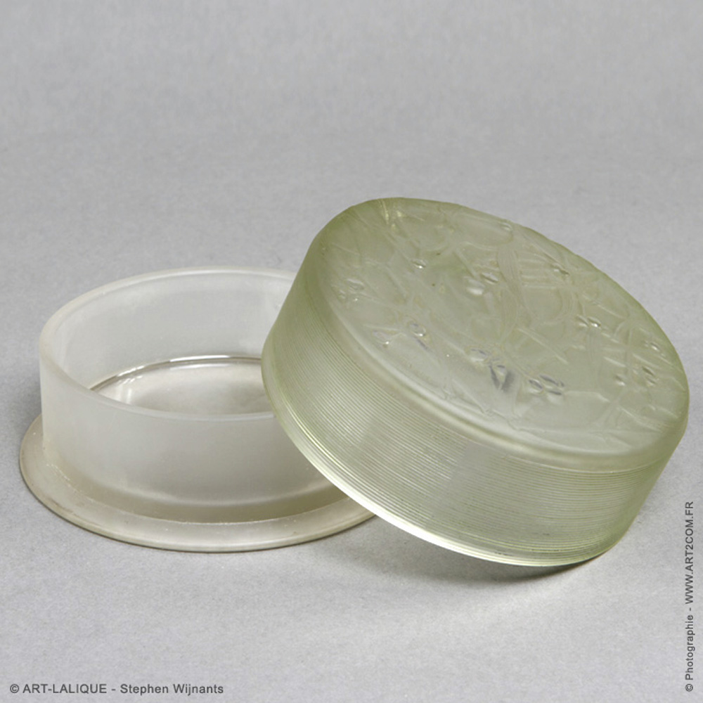 Verre blanc - Patine verte. Référence : Félix Marcilhac, catalogue raisonné de l'oeuvre de verre de R.Lalique, éd. de l'Amateur Paris, 1994, p. 234