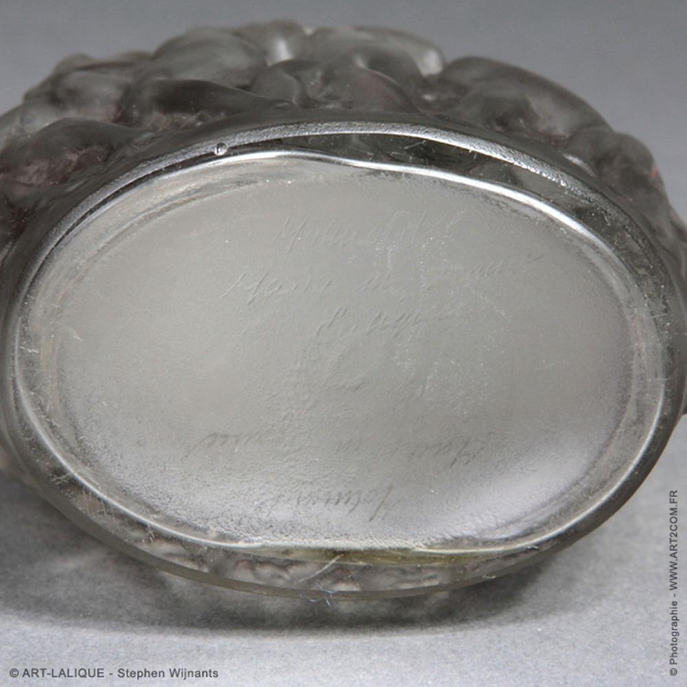 Verre blanc - Patine grise. Référence : Félix Marcilhac, catalogue raisonné de l'oeuvre de verre de R.Lalique, éd. de l'Amateur Paris, 1994, p.946