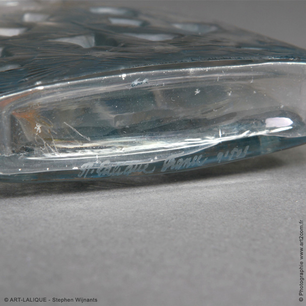 Verre blanc - Patine bleue. Référence : Félix Marcilhac, catalogue raisonné de l'oeuvre de verre de R.Lalique, éd. de l'Amateur Paris, 1994, p.332