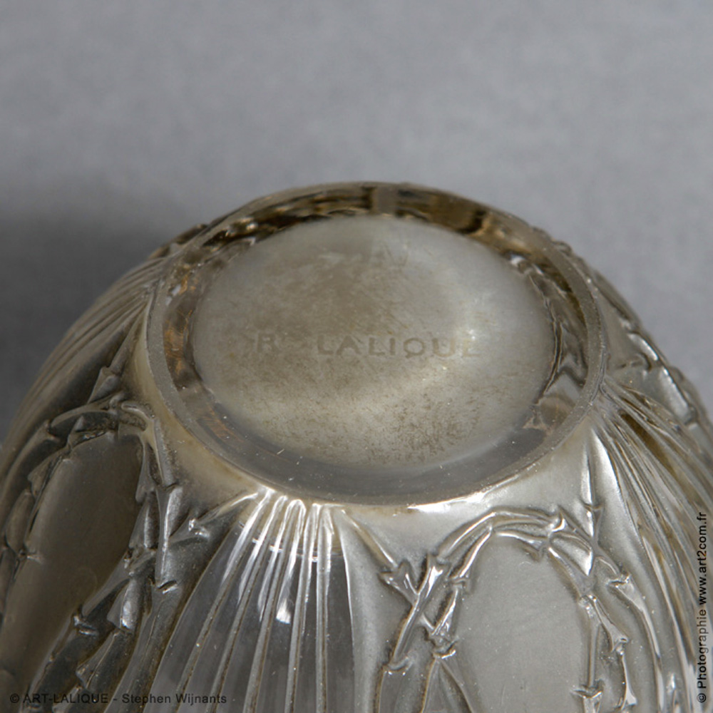 Verre blanc - Patine grise. Référence : Félix Marcilhac, catalogue raisonné de l'oeuvre de verre de R.Lalique, éd. de l'Amateur Paris, 1994, p.225