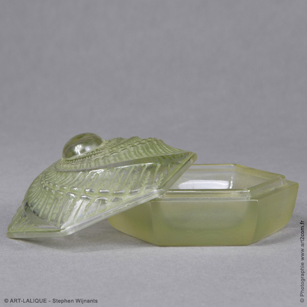Verre blanc - Patine verte. Référence : Félix Marcilhac, catalogue raisonné de l'oeuvre de verre de R.Lalique, éd. de l'Amateur Paris, 1994, p.237