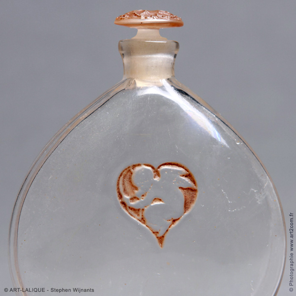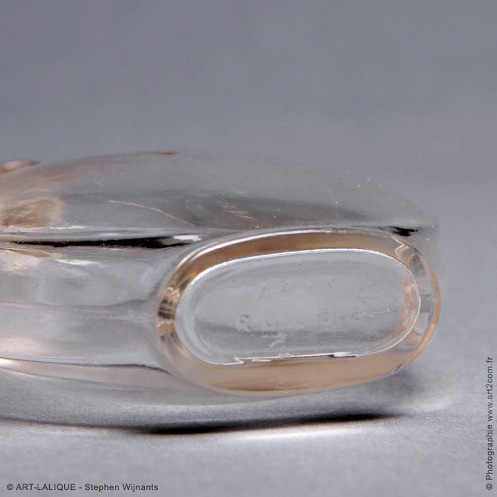 Verre blanc - Patine Sienne - Marqué Arys signature moulée. Référence : Félix Marcilhac, catalogue raisonné de l'oeuvre de verre de R.Lalique, éd. de l'Amateur Paris, 1994, p.924