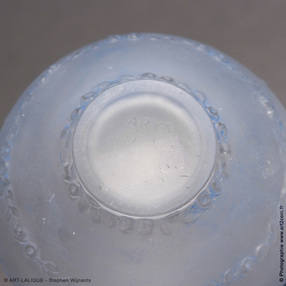 Verre blanc - Signature moulée. Référence : Félix Marcilhac, catalogue raisonné de l'oeuvre de verre de R.Lalique, éd. de l'Amateur Paris, 1994, p. 923