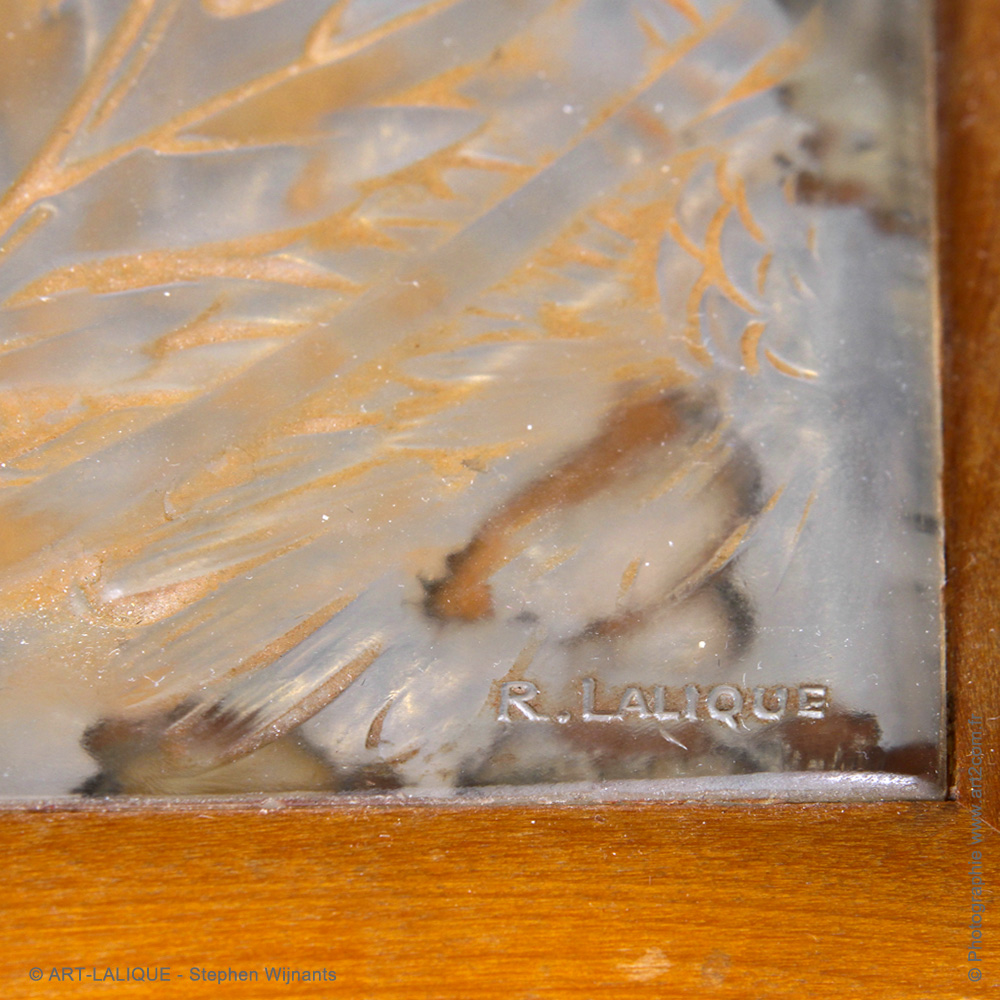 Verre blanc patiné sur fond argenté - Bâti en acajou - Avec jetons de jeu en nacre. Référence : Félix Marcilhac, catalogue raisonné de l'oeuvre de verre de R.Lalique, éd. de l'Amateur Paris, 1994, p.287
