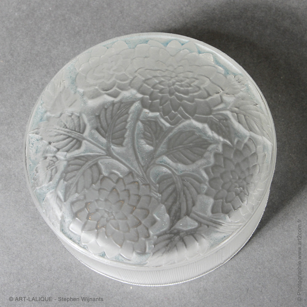 Verre blanc - Patine bleue - Avec sa boîte carton d'origine. Référence : Félix Marcilhac, catalogue raisonné de l'oeuvre de verre de R.Lalique, éd. de l'Amateur Paris, 1994, p.234