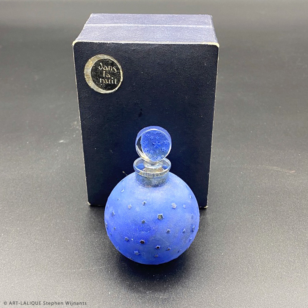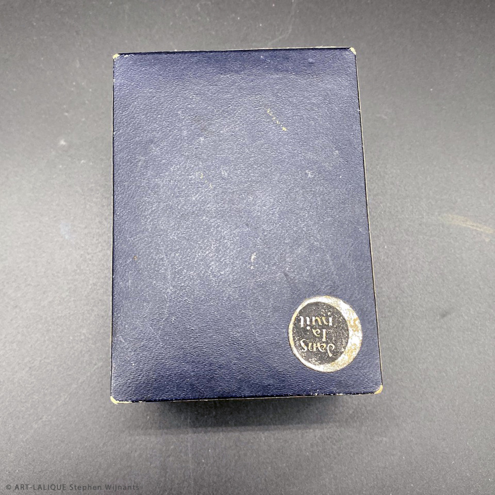 Verre blanc - Patine bleue - Flacon dans sa boite d'origine. Référence : Félix Marcilhac, catalogue raisonné de l'oeuvre de verre de R.Lalique, éd. de l'Amateur Paris, 1994, p.951