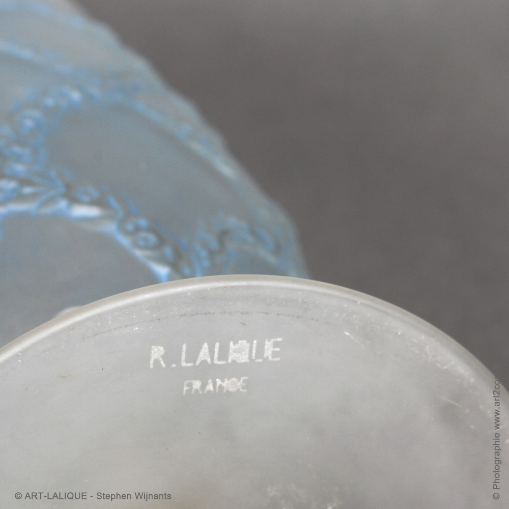 Verre blanc - Patine bleue. Référence : Félix Marcilhac, catalogue raisonné de l'oeuvre de verre de R.Lalique, éd. de l'Amateur Paris, 1994, p.625