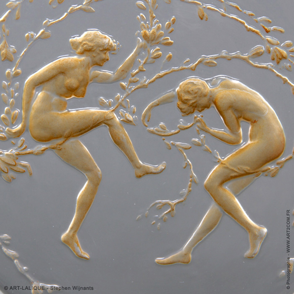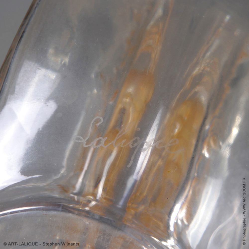 Verre blanc - Patine Sienne. Signature à la main LALIQUE. Référence : Félix Marcilhac, catalogue raisonné de l'oeuvre de verre de R.Lalique, éd. de l'Amateur Paris, 1994, p. 737.