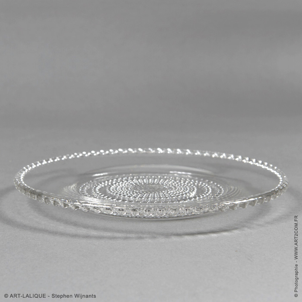 10 assiettes à dessert. Verre blanc. Référence : Félix Marcilhac, catalogue raisonné de l'oeuvre de verre de R.Lalique, éd. de l'Amateur Paris, 1994, p. 721