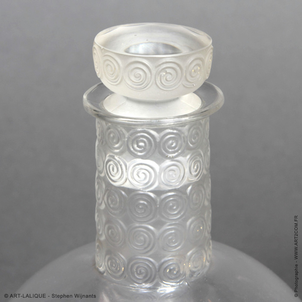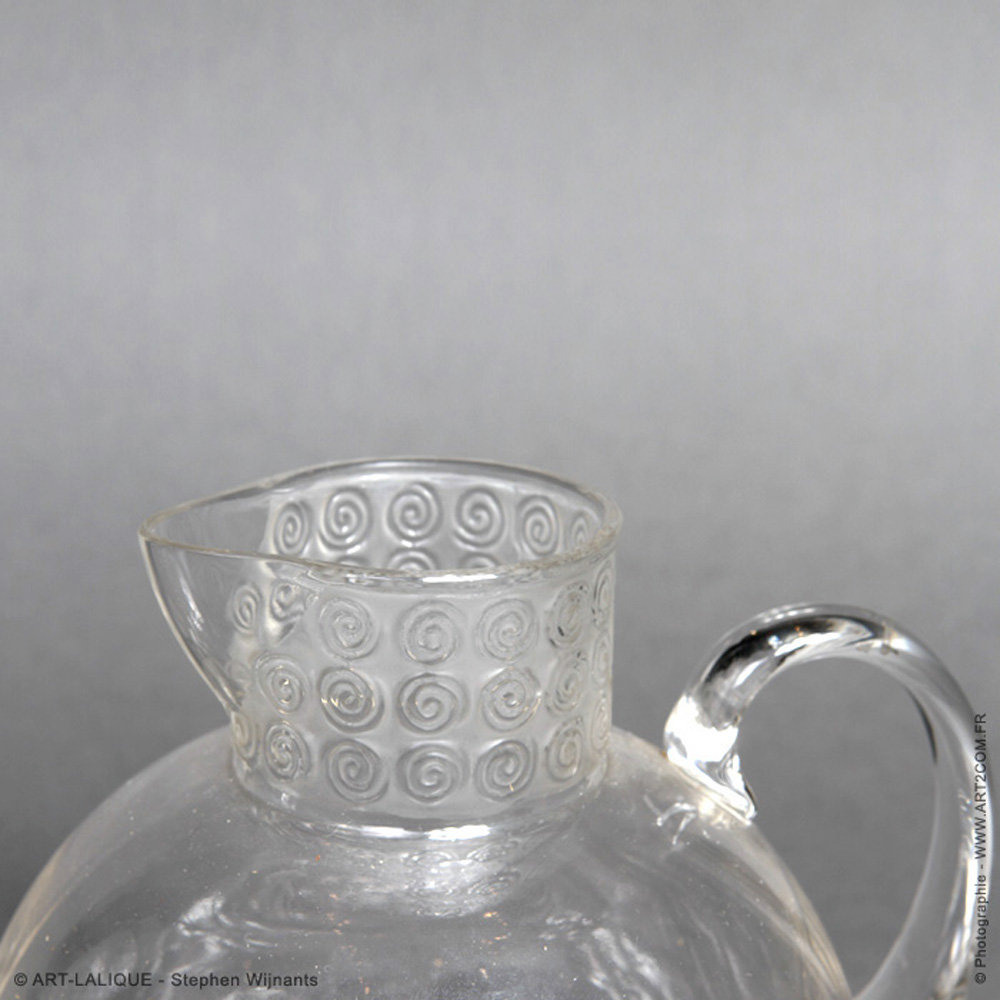 Verres Carafe et Broc - Service pour 9 (Champagne - vin blanc - vin rouge - eau). Verre blanc. Référence : Félix Marcilhac, catalogue raisonné de l'oeuvre de verre de R.Lalique, éd. de l'Amateur Paris, 1994, p.846