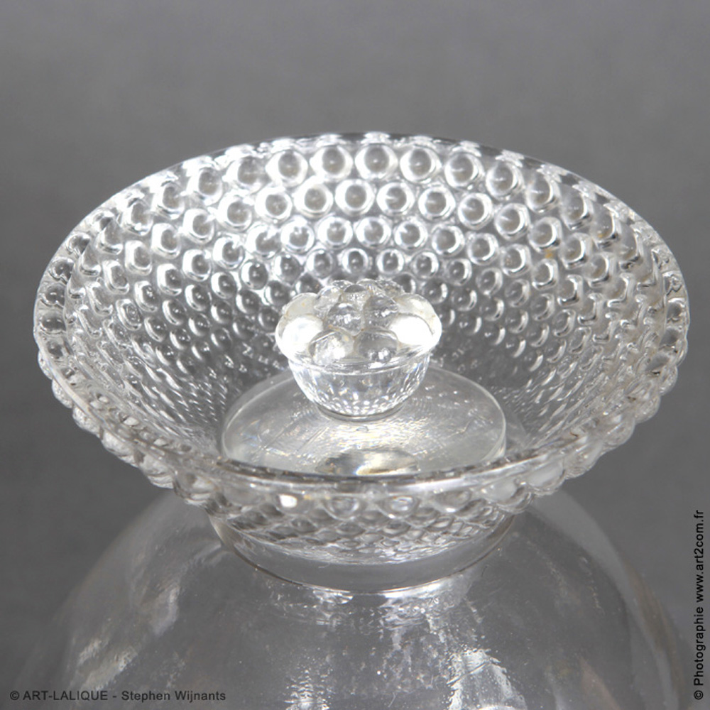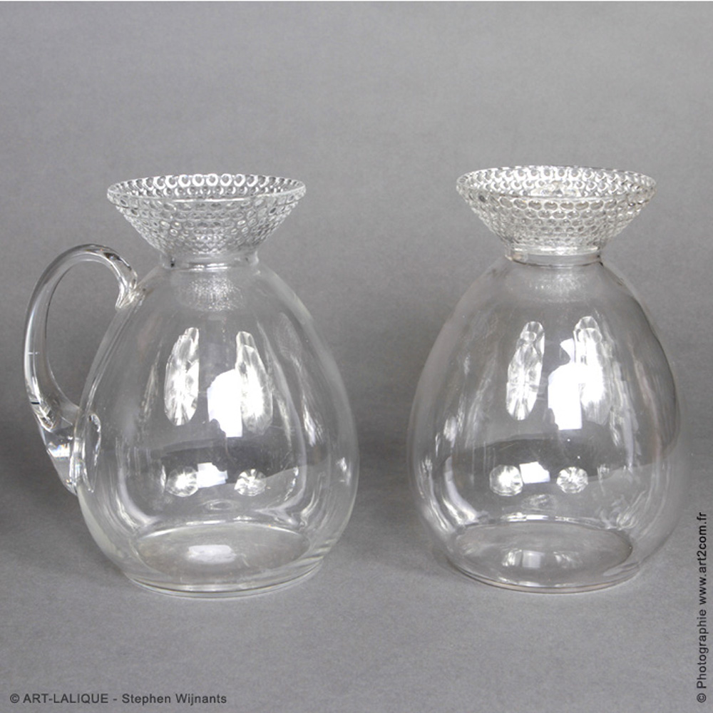 Verres Carafe et Broc - Service pour 8(4 Champagne - 10 madère - 11 vin blanc - 8 vin rouge - 17 eau). Verre blanc Référence : Félix Marcilhac, catalogue raisonné de l'oeuvre de verre de R.Lalique, éd. de l'Amateur Paris, 1994, p.848