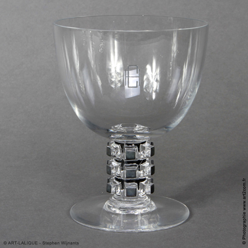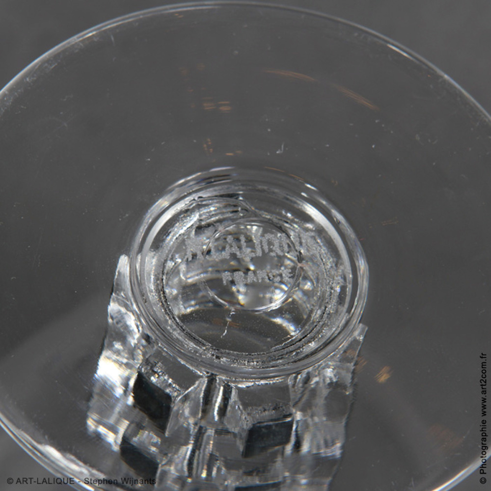 Service pour 6 (Champagne - porto - vin rouge - eau). Verre blanc - Pied émaillé. Référence : Félix Marcilhac, catalogue raisonné de l'oeuvre de verre de R.Lalique, éd. de l'Amateur Paris, 1994, p.837