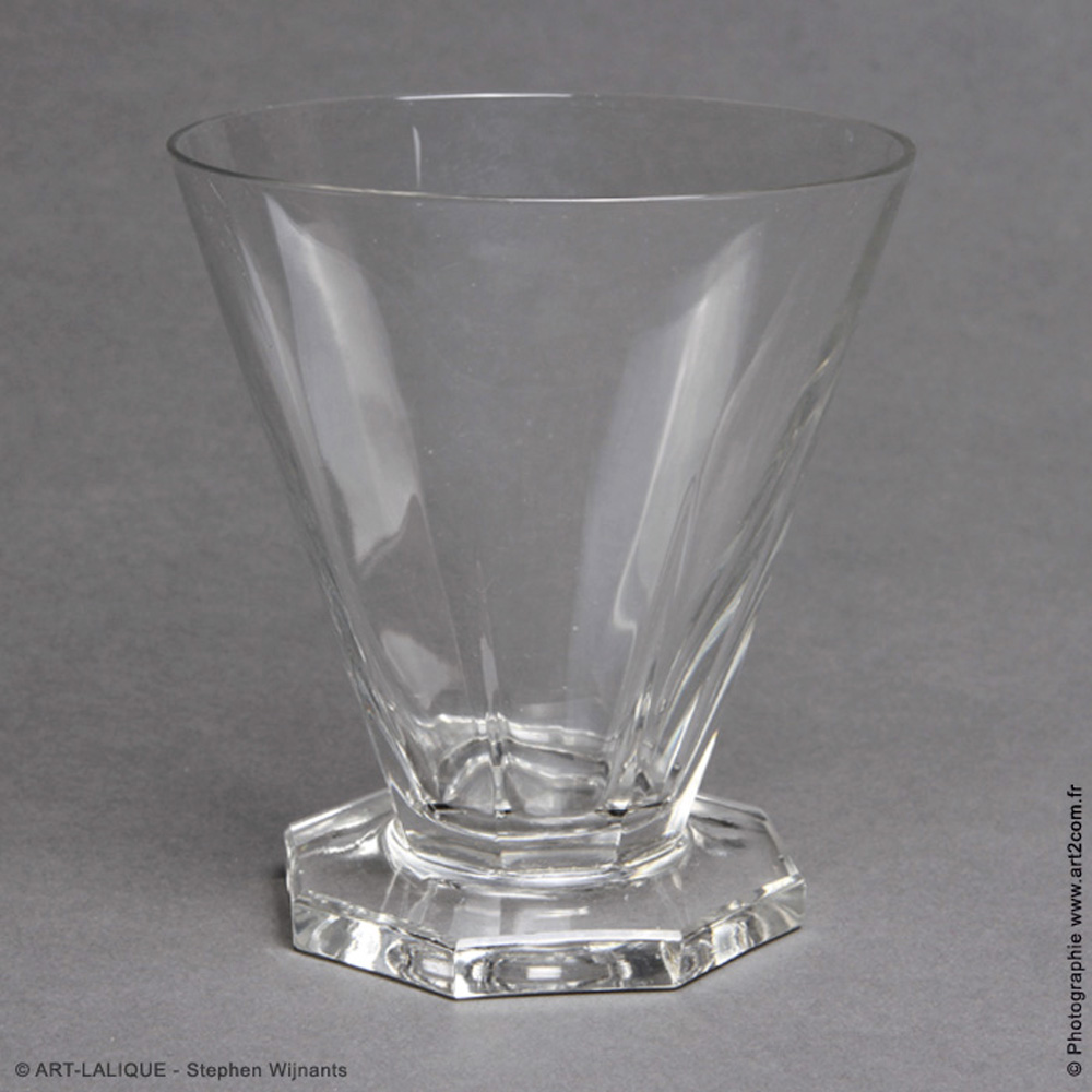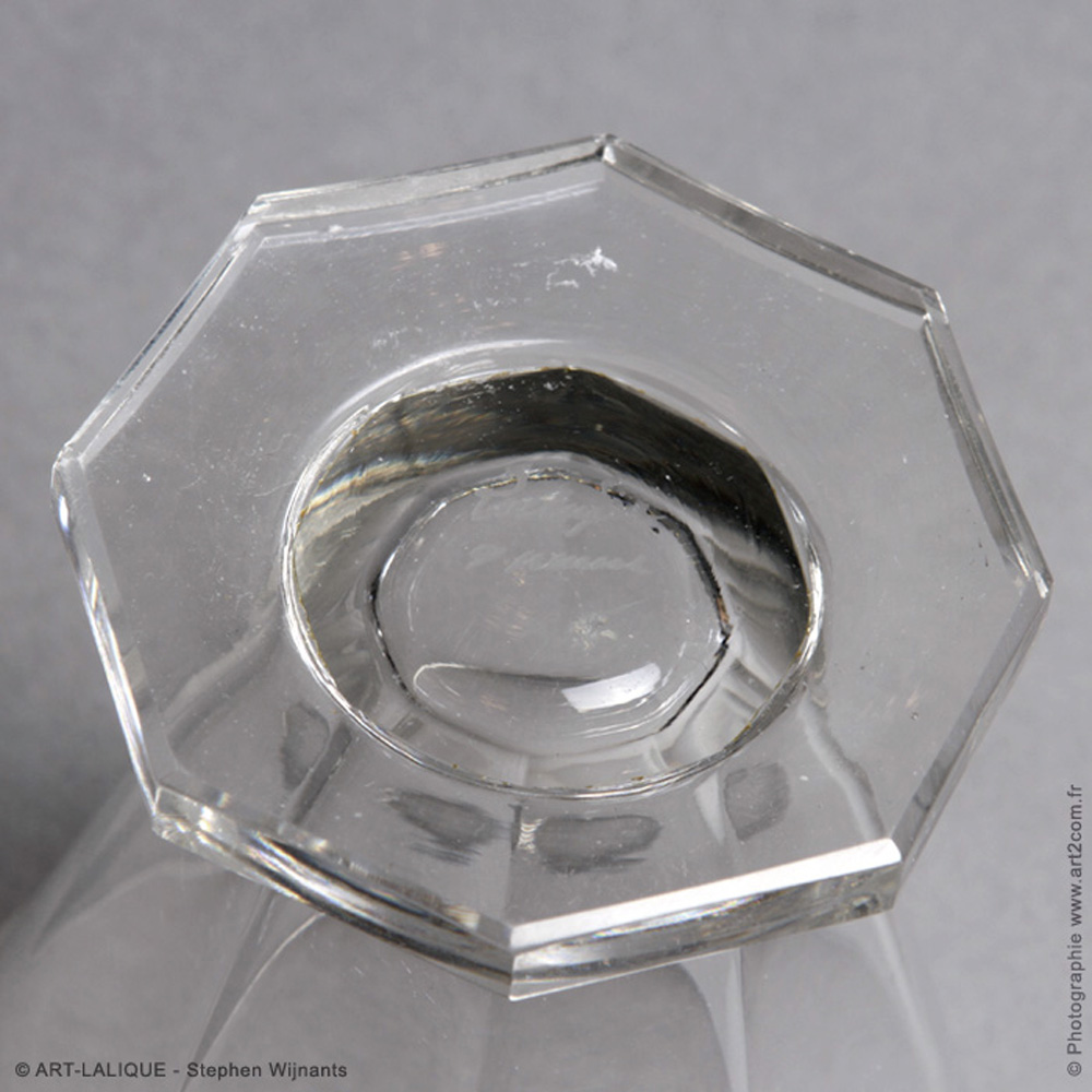 Service: 14 Champagne - 11 vin blanc - 9 vin rouge - 13 eau . Verre blanc. Référence : Félix Marcilhac, catalogue raisonné de l'oeuvre de verre de R.Lalique, éd. de l'Amateur Paris, 1994, p. 851