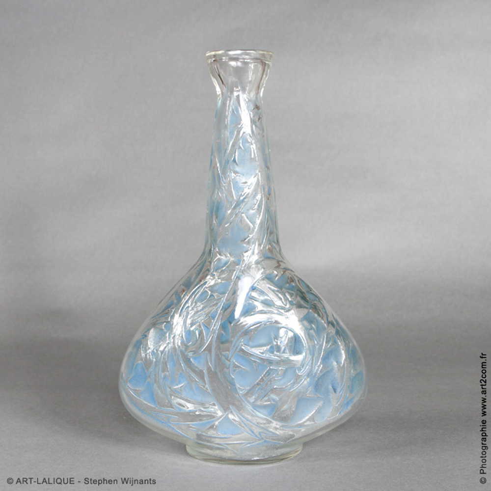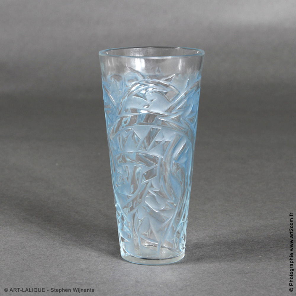 Ensemble de 1 carafe plate et 6 gobelets. Verre blanc - patine bleue. Référence : Félix Marcilhac, catalogue raisonné de l'oeuvre de verre de R.Lalique, éd. de l'Amateur Paris, 1994, p.741 et768