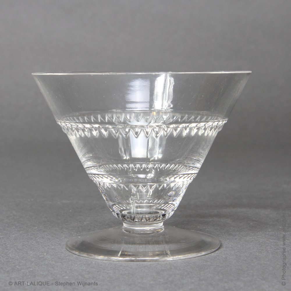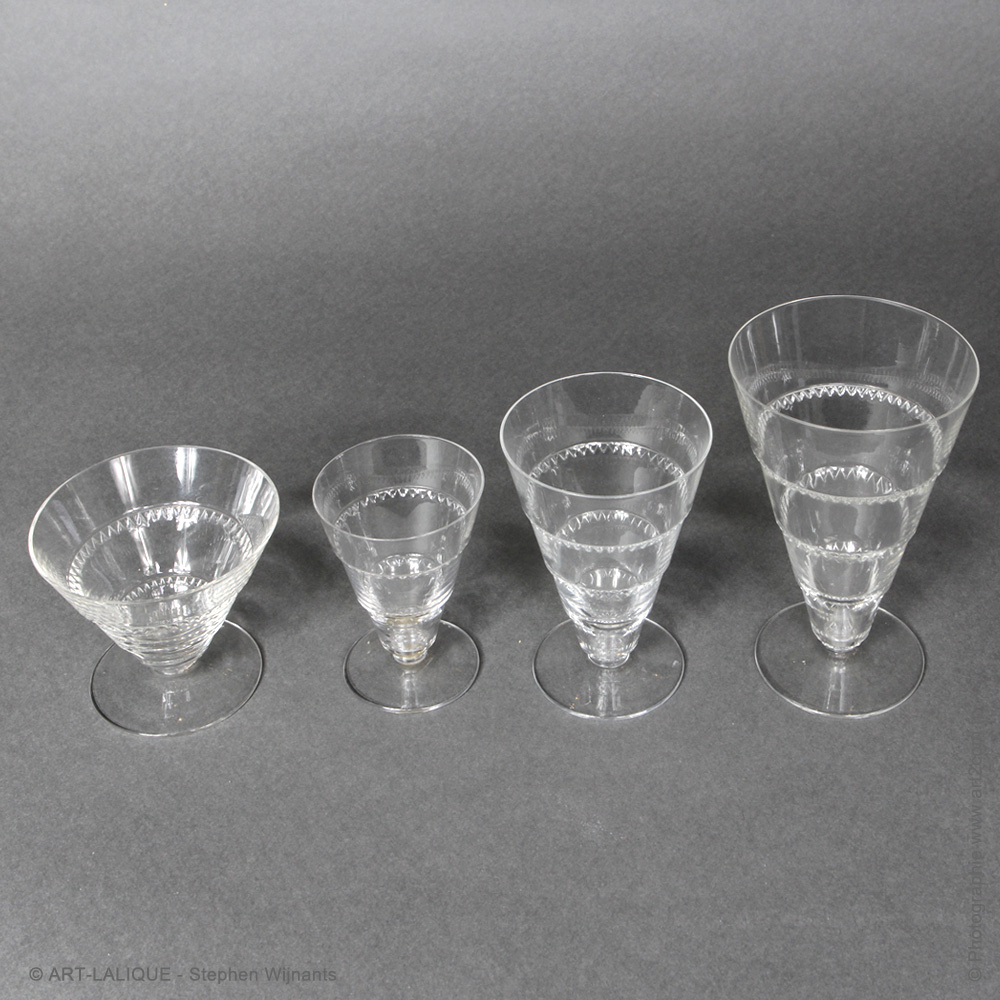 Service: 11 Champagne - 10 vin blanc - 20 vin rouge - 13 eau - Verre blanc Référence : Félix Marcilhac, catalogue raisonné de l'oeuvre de verre de R.Lalique, éd. de l'Amateur Paris, 1994, p.845