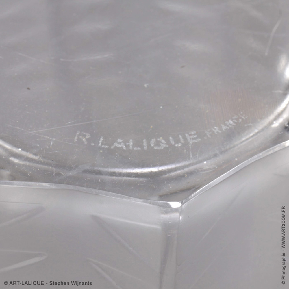 Service composé de 8 gobelets et 1 broc. Référence : Félix Marcilhac, catalogue raisonné de l'oeuvre de verre de R.Lalique, éd. de l'Amateur Paris, 1994, p. 746-769