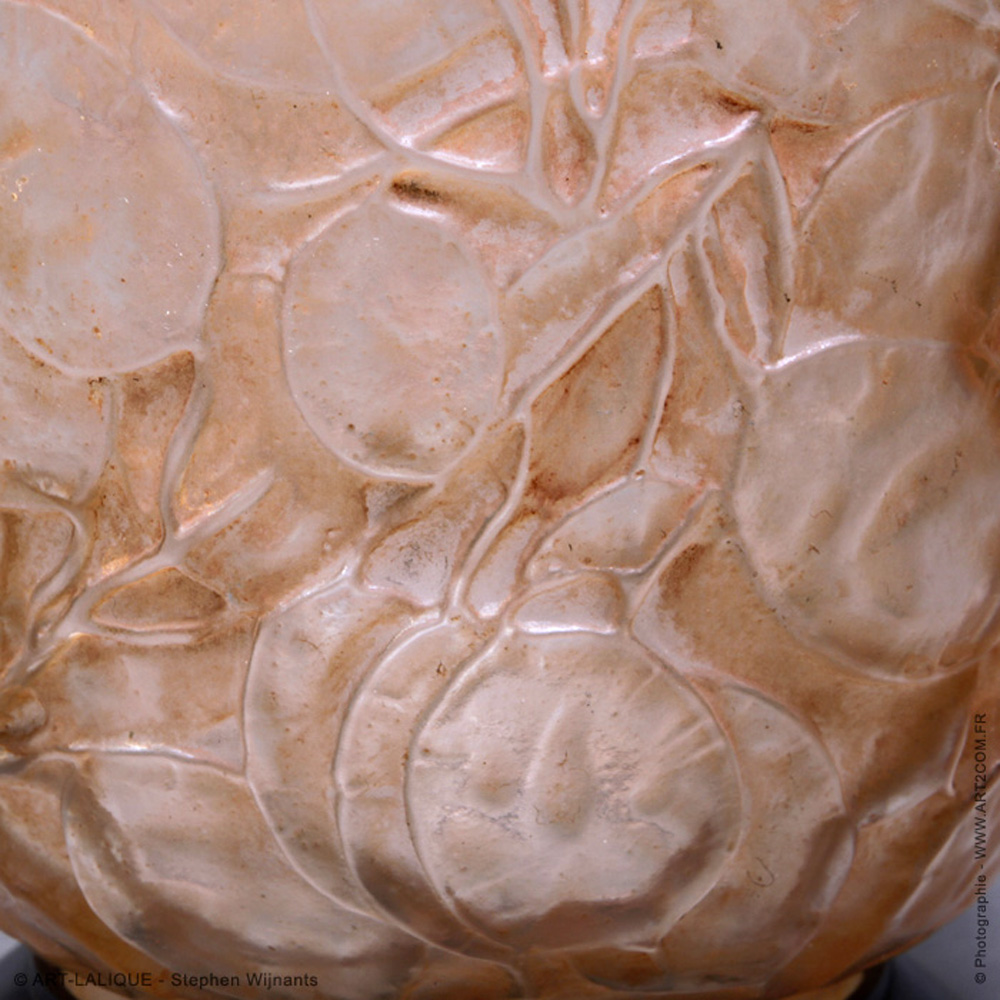 Verre blanc patiné sienne. Référence : Félix Marcilhac, catalogue raisonné de l'oeuvre de verre de R.Lalique, éd. de l'Amateur Paris, 1994, p. 416.