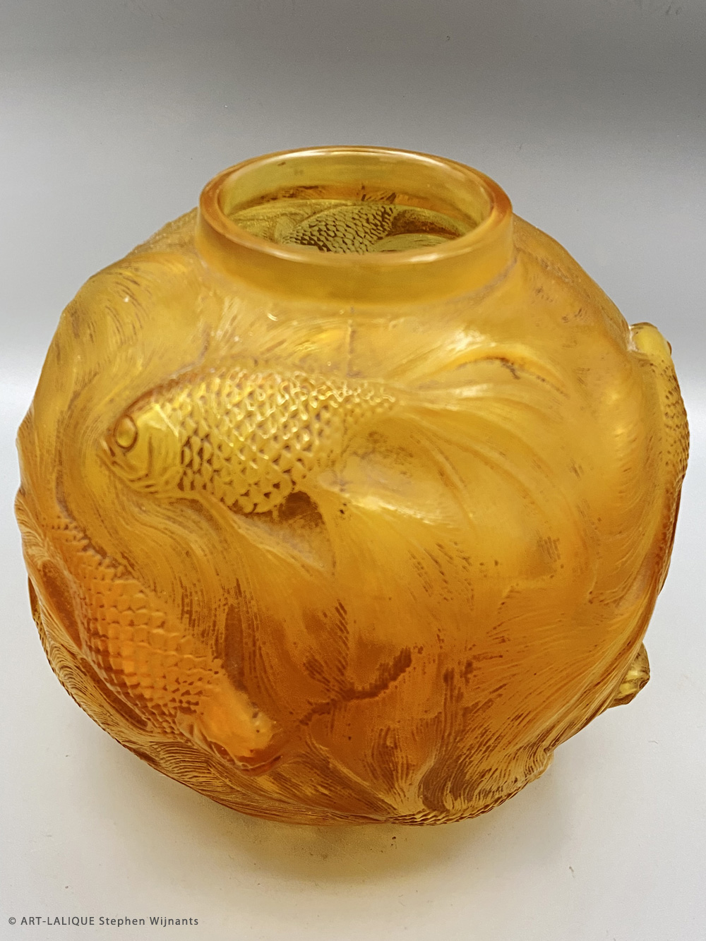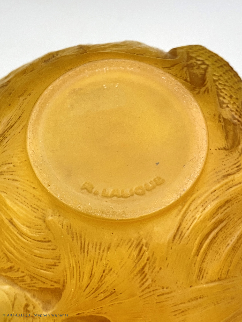 Verre orange - Patine sienne. Référence : Félix Marcilhac, catalogue raisonné de l'oeuvre de verre de R.Lalique, éd. de l'Amateur Paris, 1994, p.425