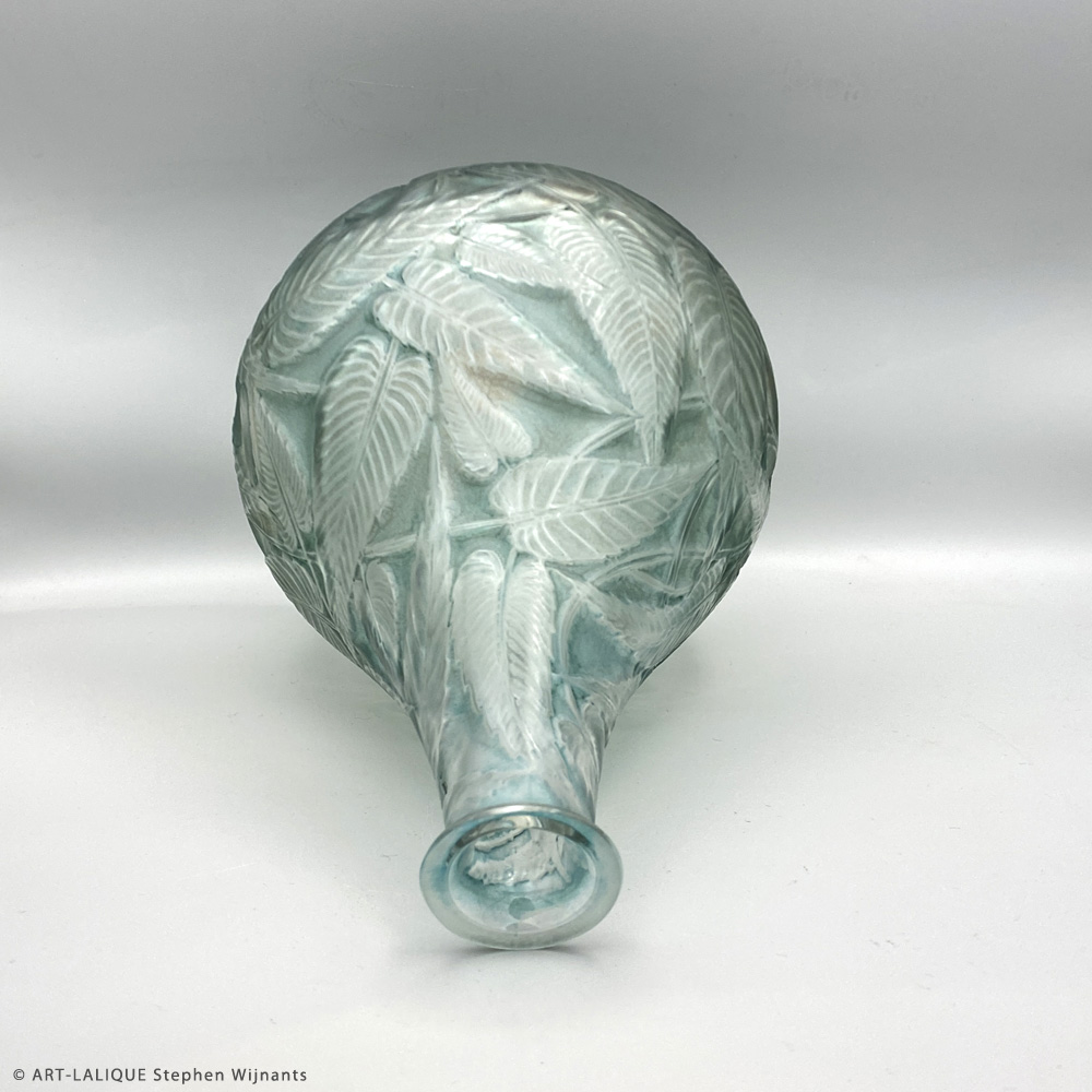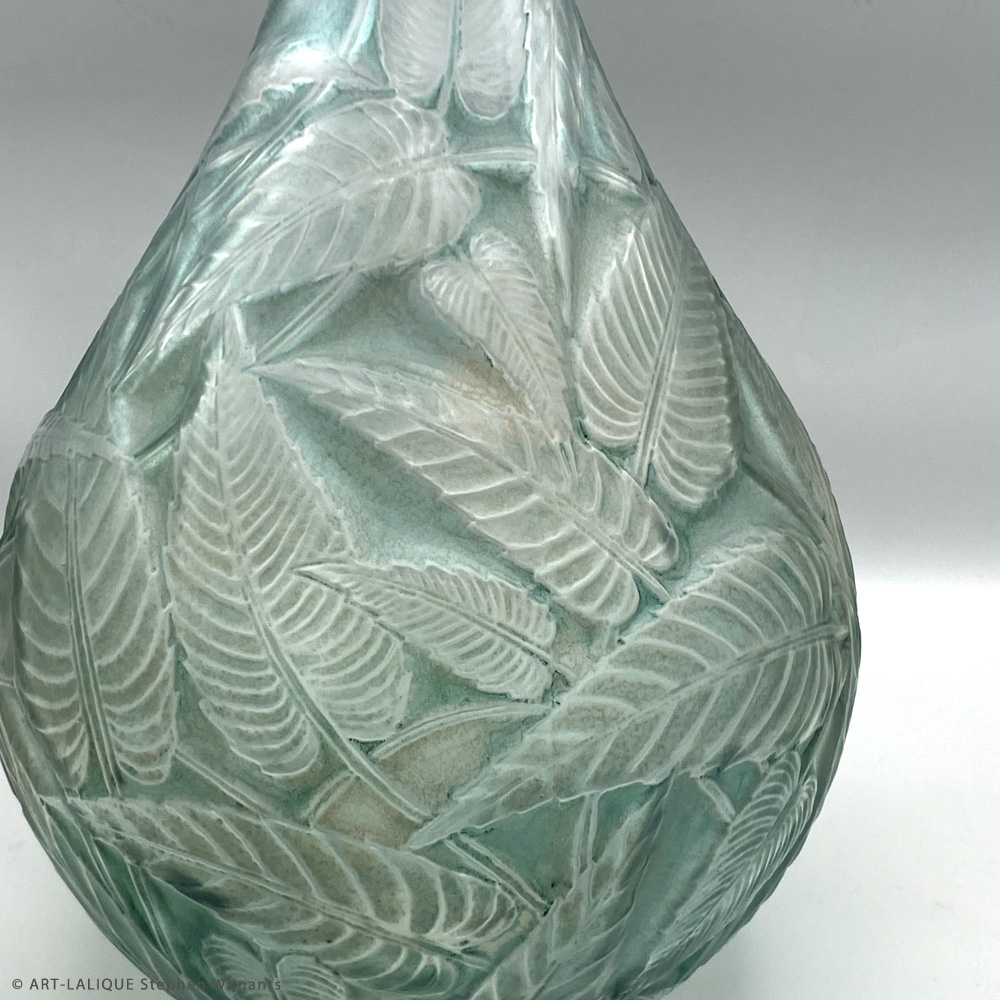 Verre blanc - Patine verte. Référence : Félix Marcilhac, catalogue raisonné de l'oeuvre de verre de R.Lalique, éd. de l'Amateur Paris, 1994, p.425