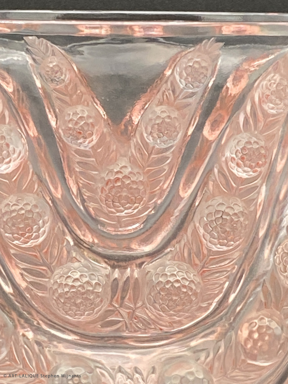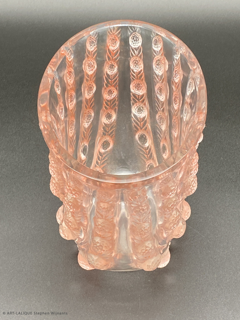 Vase Vichy, fait en 1937 en verre blanc patiné vieux rose Référence : Félix Marcilhac, catalogue raisonné de l'oeuvre de verre de R.Lalique, éd. de l'Amateur Paris, 1994, p.466