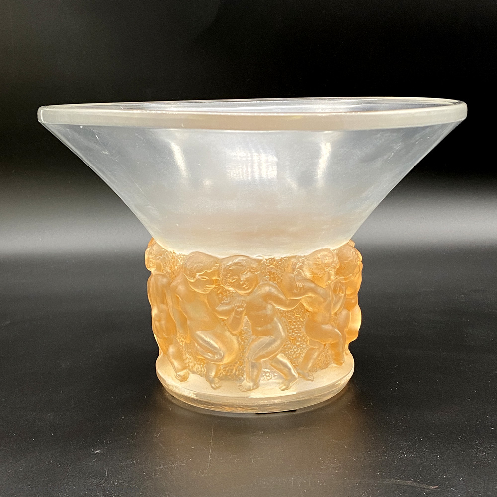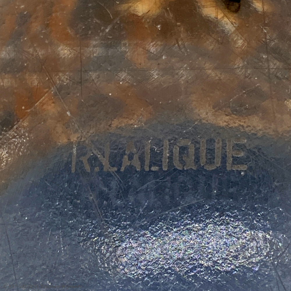 Verre blanc satiné - Patine sienne - Signature sablée en lettres capitales. Référence : Félix Marcilhac, catalogue raisonné de l'oeuvre de verre de R.Lalique, éd. de l'Amateur Paris, 1994, p.450