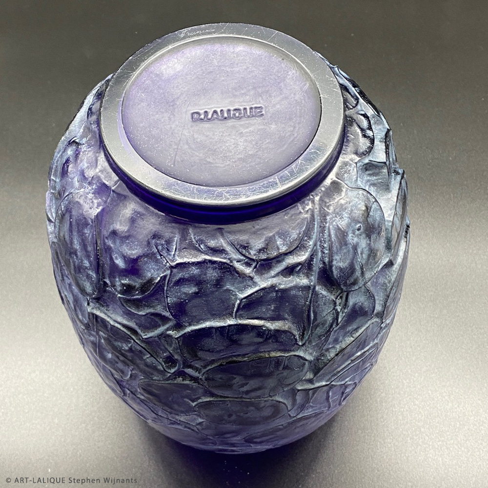 Verre violet - Patine blanche. Référence : Félix Marcilhac, catalogue raisonné de l'oeuvre de verre de R.Lalique, éd. de l'Amateur Paris, 1994, p.416