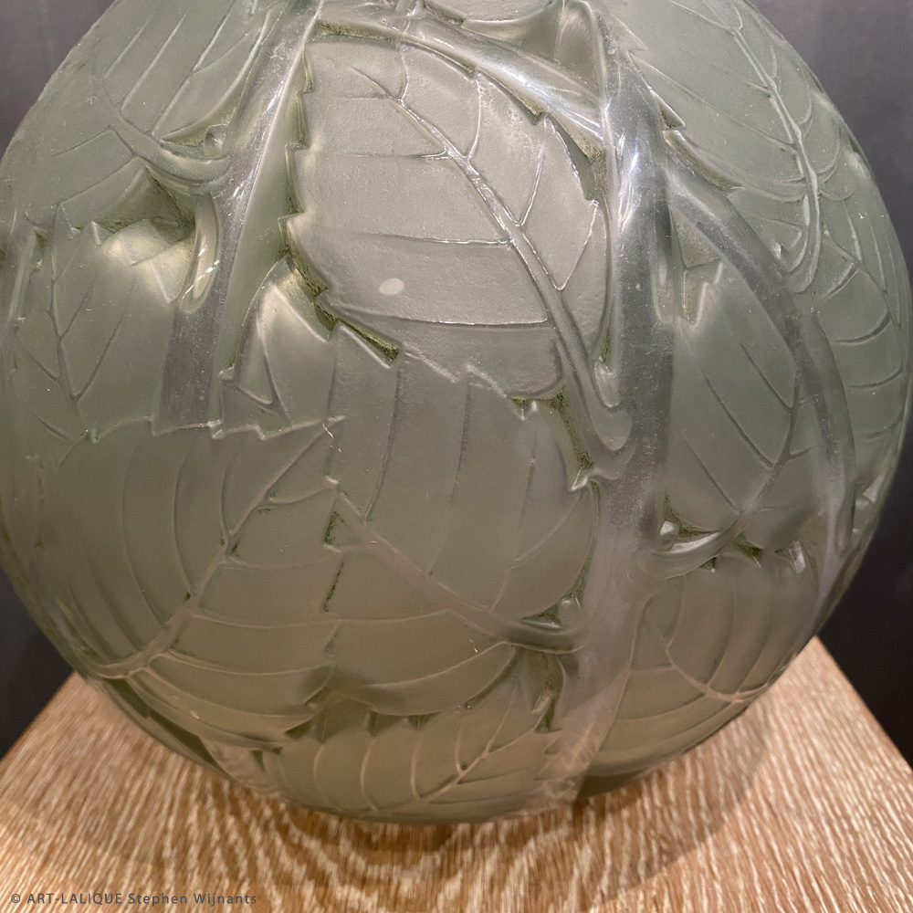 Verre blanc - Patine verte. Référence : Félix Marcilhac, catalogue raisonné de l'oeuvre de verre de R.Lalique, éd. de l'Amateur Paris, 1994, p.444