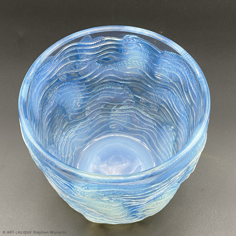 Verre opalescent - Patine bleue. Référence : Félix Marcilhac, catalogue raisonné de l'oeuvre de verre de R.Lalique, éd. de l'Amateur Paris, 1994, p.464