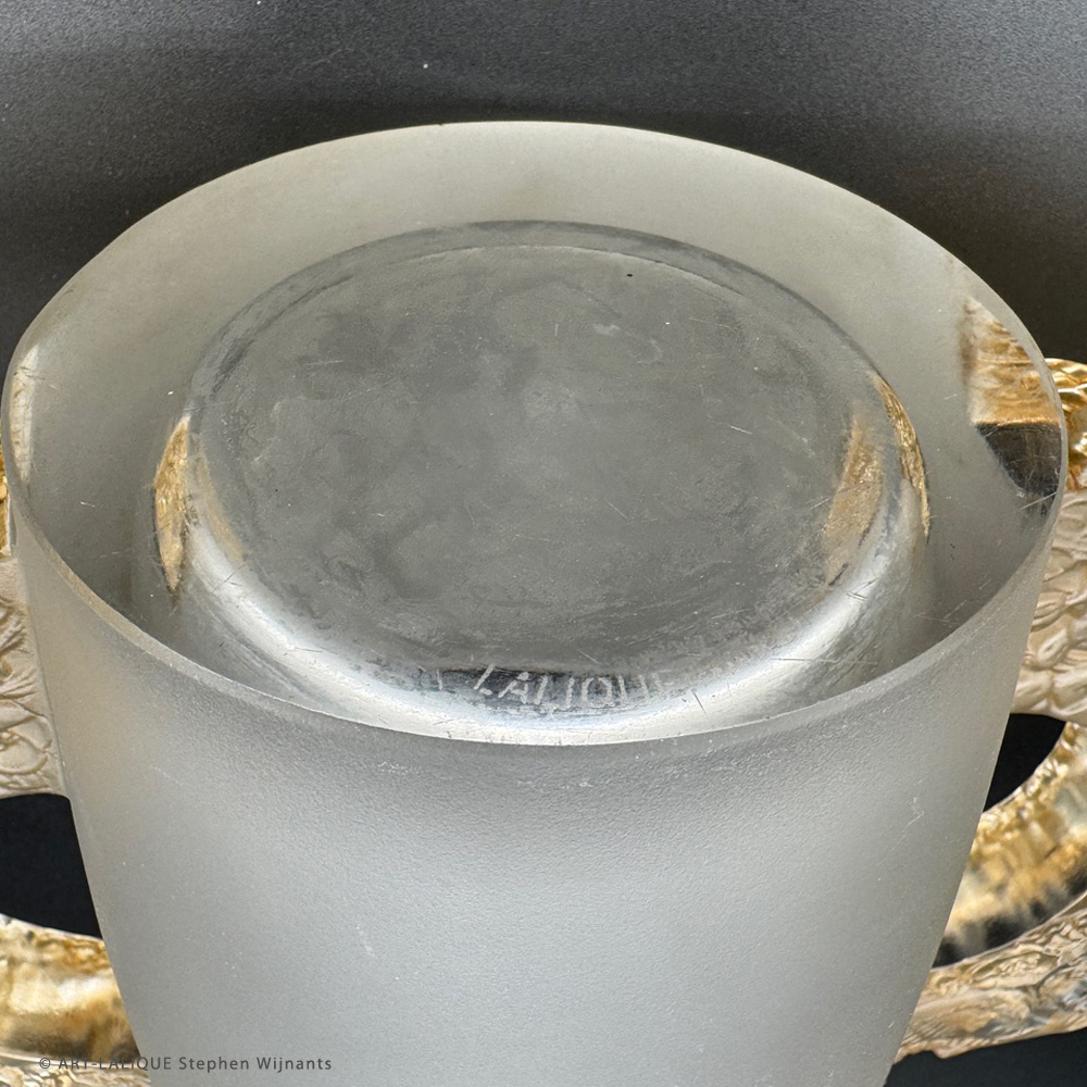 Verre blanc satiné - Patine sienne. Référence : Félix Marcilhac, catalogue raisonné de l'oeuvre de verre de R.Lalique, éd. de l'Amateur Paris, 1994, N°1024 p.444