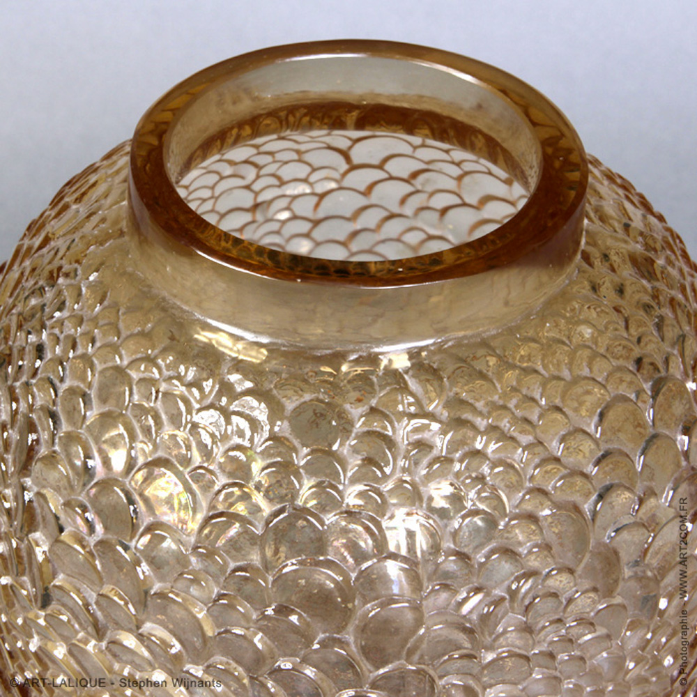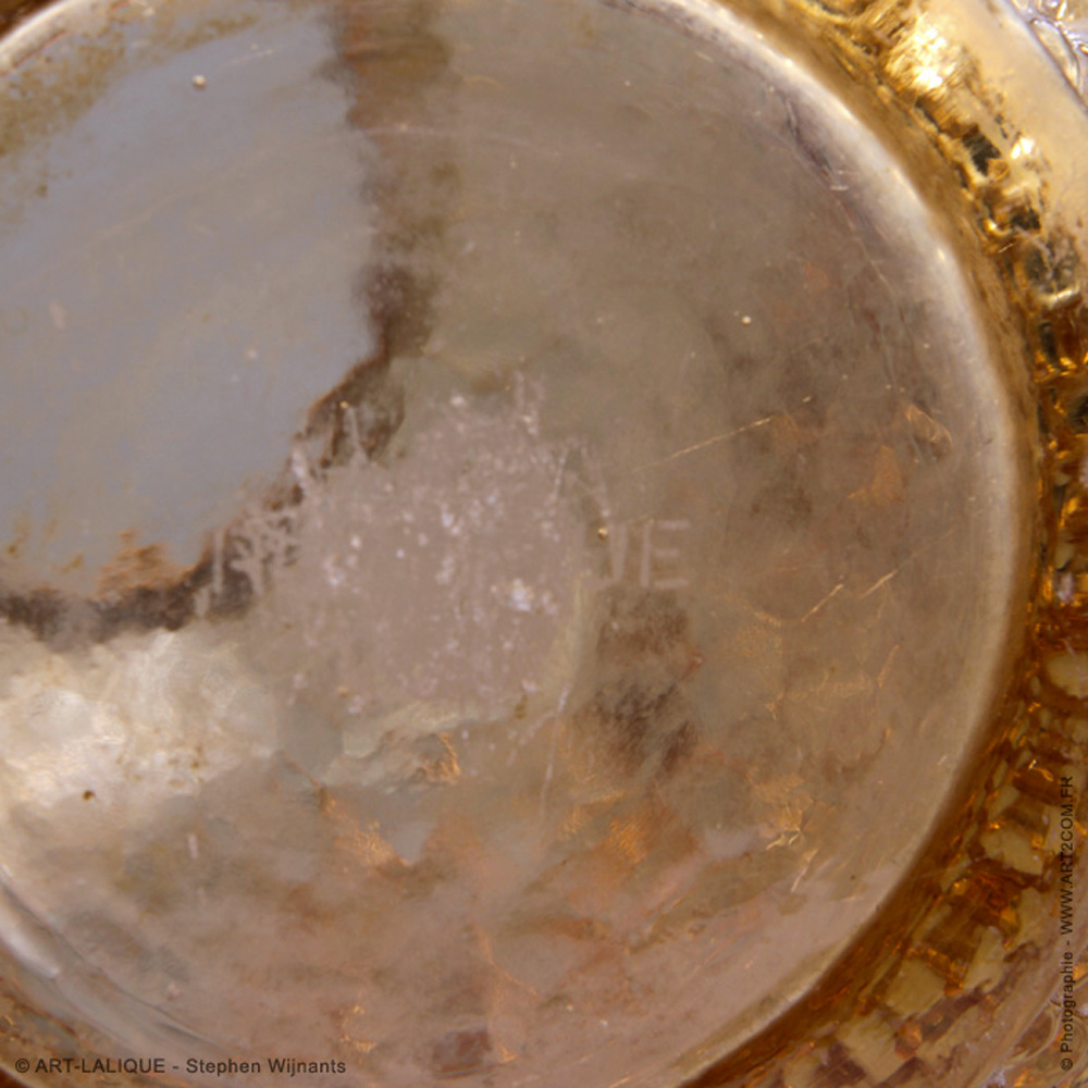 Verre couleur miel - Une paire. Référence : Félix Marcilhac, catalogue raisonné de l'oeuvre de verre de R.Lalique, éd. de l'Amateur Paris, 1994, p. 456