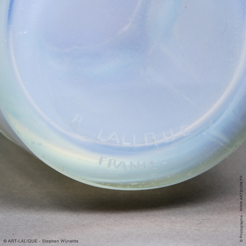 Verre opalescent - Patine bleue - Une paire. Référence : Félix Marcilhac, catalogue raisonné de l'oeuvre de verre de R.Lalique, éd. de l'Amateur Paris, 1994, p. 418