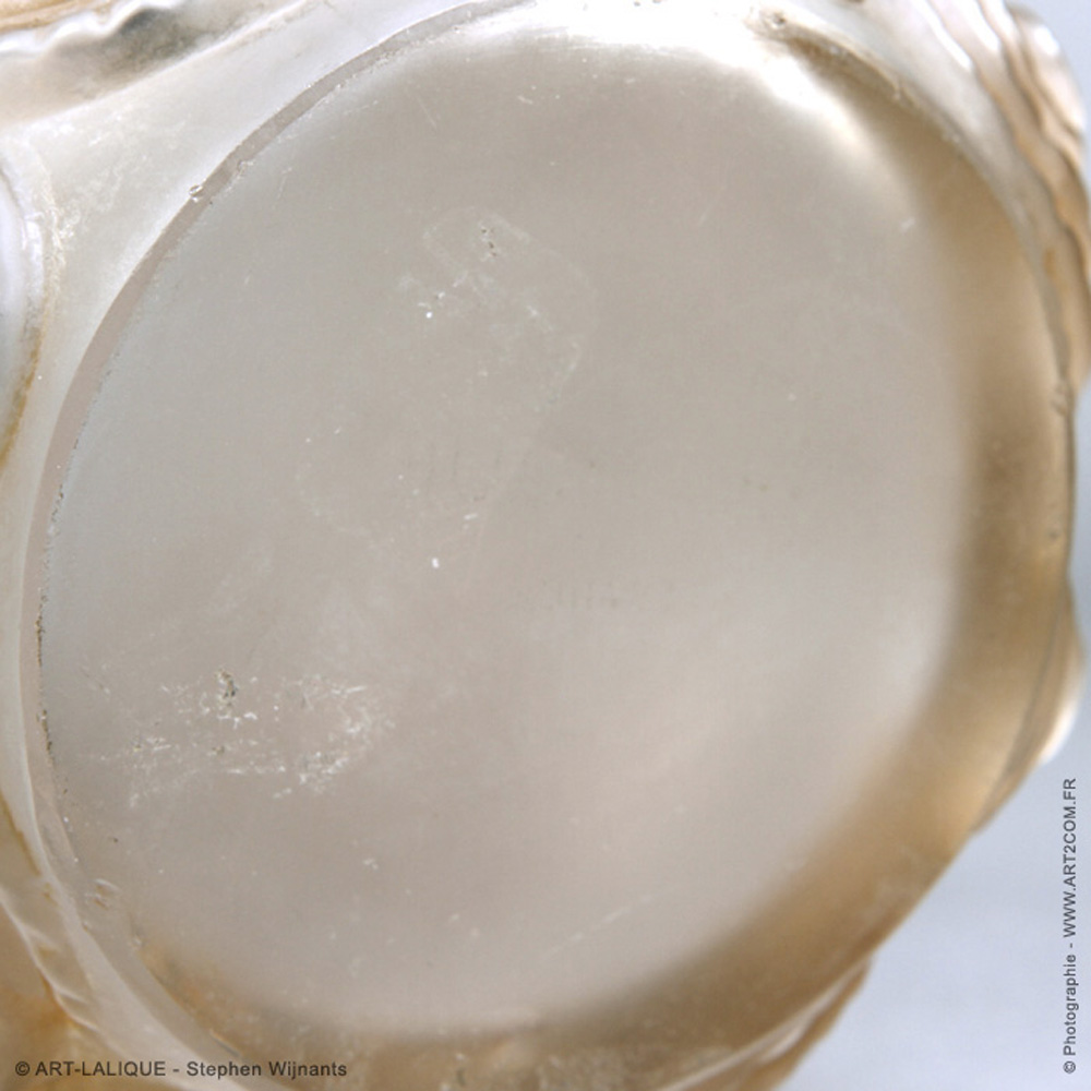 Verre blanc - Patine Sienne. Référence : Félix Marcilhac, catalogue raisonné de l'oeuvre de verre de R.Lalique, éd. de l'Amateur Paris, 1994, p. 451