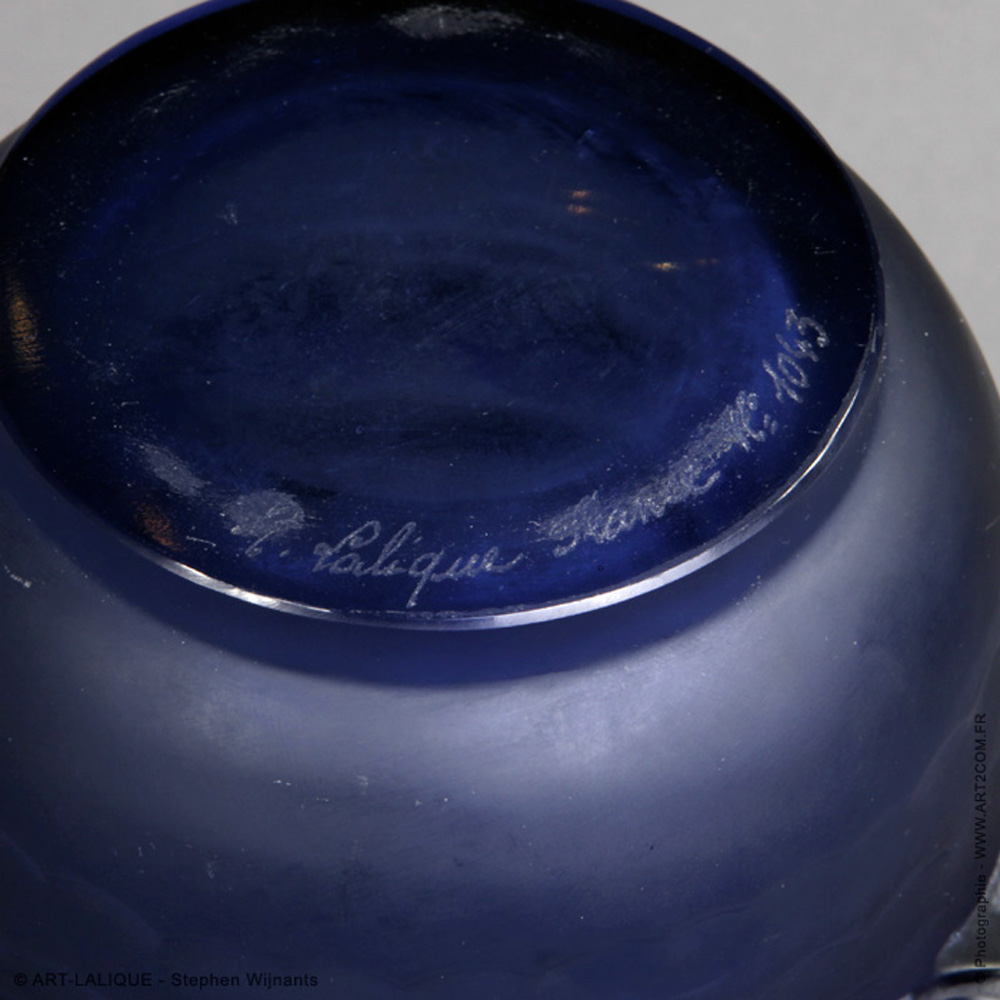 Verre couleur bleue. Référence : Félix Marcilhac, catalogue raisonné de l'oeuvre de verre de R.Lalique, éd. de l'Amateur Paris, 1994, p. 447