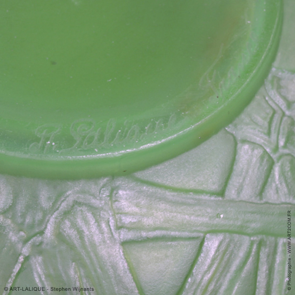 Verre couleur vert jade. Référence : Félix Marcilhac, catalogue raisonné de l'oeuvre de verre de R.Lalique, éd. de l'Amateur Paris, 1994, p. 425