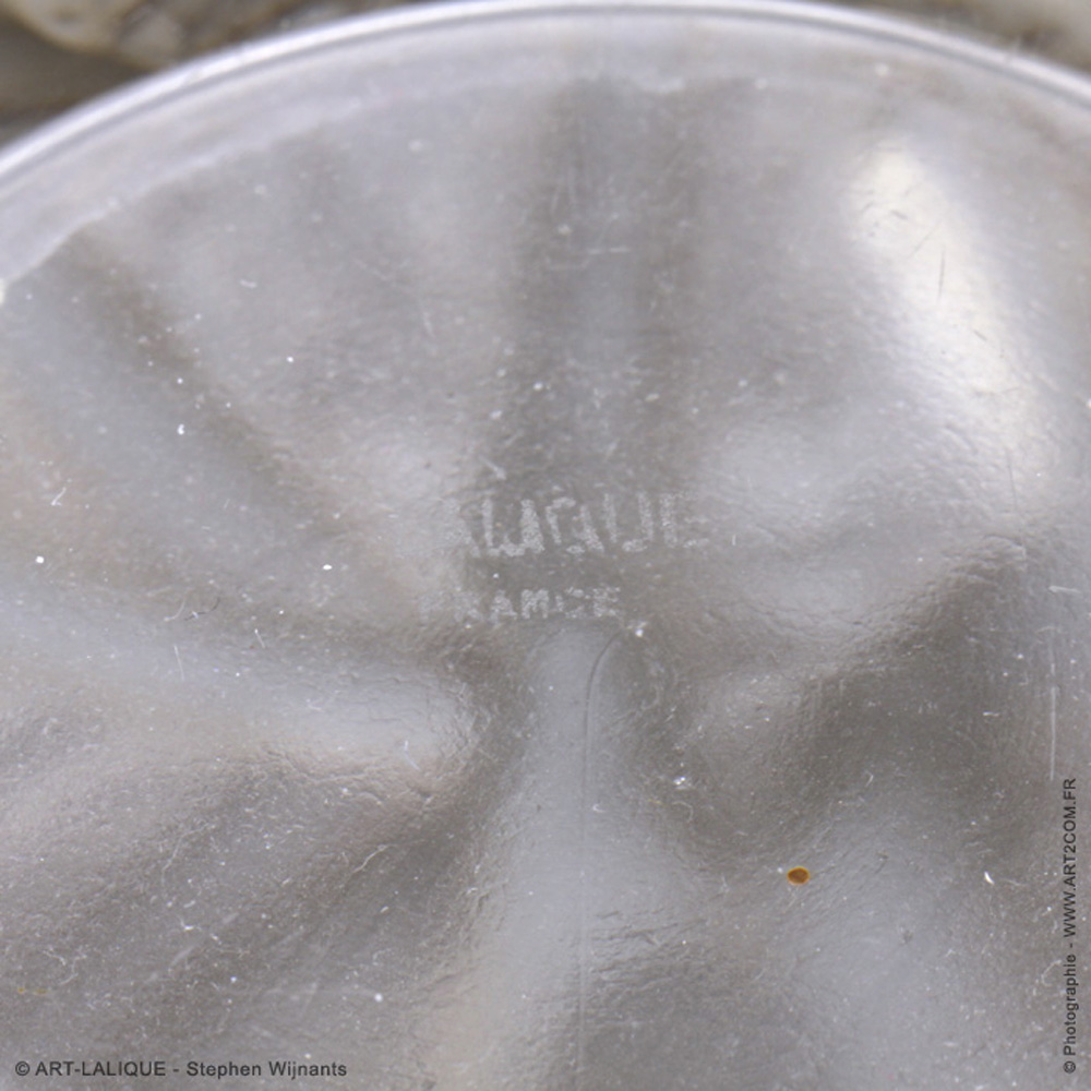 Verre blanc. Patine Sienne. Référence : Félix Marcilhac, catalogue raisonné de l'oeuvre de verre de R.Lalique, éd. de l'Amateur Paris, 1994, p. 438