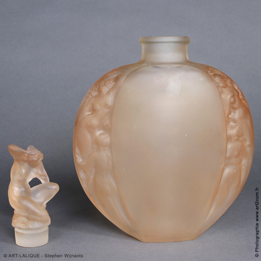 Verre blanc - Patine Sienne. Dit aussi vase méplat "Groupes figurines" Référence : Félix Marcilhac, catalogue raisonné de l'oeuvre de verre de R.Lalique, éd. de l'Amateur Paris, 1994, p.411